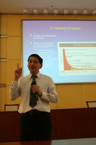 “Every click is money.”Tung Bui用生动形象的表述,向同学们介绍了网络营销的四条“黄金准则”:Reputation信誉原则、Transaction交易原则、Trust信任原则以及Retention保持原则。 Tung Bui强调:“市场营销还有‘8Ps’。 Product商品、Place地点、 Promotion促销、 Price价格、 Promptness 敏捷、 Personalization个性化,、Pull/Push推/拉和Privacy 隐私。“从网络上获取资源,把资源推向消费者,这就是进行网络营销的公司需要做的事情。”他指出进行网络营销时,公司越了解顾客,就可以为顾客提供更多的服务,从而提升顾客的满意度。“成功的网络营销策略中最重要的一点就是要了解消费者,要个性化地对待每一个顾客,让顾客愿意在你的公司消费。”