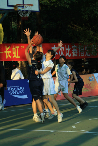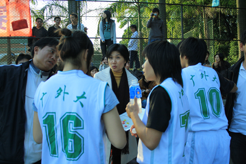 此时广外开始加强火力。第5分钟,6号许杰冰替下16号赖倩倩,她上场的意图不言而喻,当她频频跑到三分线外出手,并在离上半场比赛结束2分钟投进至关重要的三分球时,观众们一下子吼了出来,广外以14比13反超了一分。