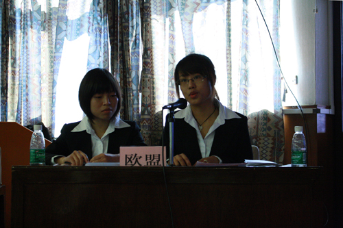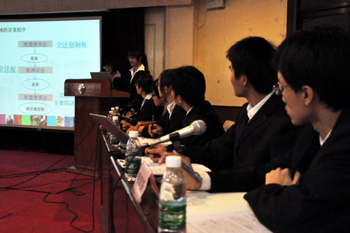 我校欧盟代表冷静应对技术问题,从容不迫地从欧盟能源政策现状、制约因素与应对措施三部分阐述观点。我校俄罗斯代表从其与欧佩克竞争、合作等行为互动的原因分析,深入探讨俄能源政策。此外,来自暨大的美国和国际能源署代表,来自中大的中国和欧佩克代表也以其专业、投入、机智的表现博得阵阵掌声。