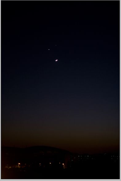 晚上6时许,夜空上惊现双星伴月奇观:夜空上,两颗明亮的星星一左一右,宛若一双顽皮的眼睛,而它们的下方,一弯月牙不偏不倚,俨然一张可爱的孩童笑脸,在黑夜的映衬下明亮动人。如此难得一见的奇观顿时在校园各处掀起一阵热潮,各人争相观看,不少人都掏出相机拍下这奇景。