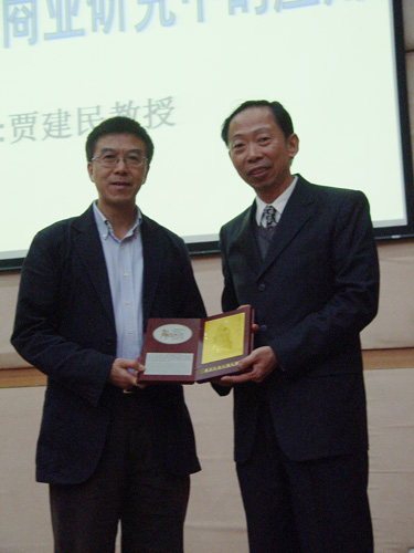 本网讯 12月2日下午,香港中文大学教授贾建民应我校管理学院的邀请,在南校图书馆学术报告厅带来一场主题为“行为经济学在商业研究中的应用”的精彩学术讲座。我校副校长董小麟、管理学院院长杨晓燕、副院长余鹏翼、刘中华以及管理学院教师出席了讲座。在讲座开始前,董小麟向贾建民赠送了礼物。