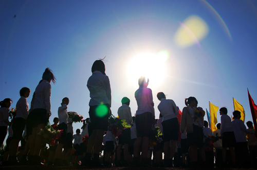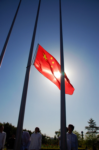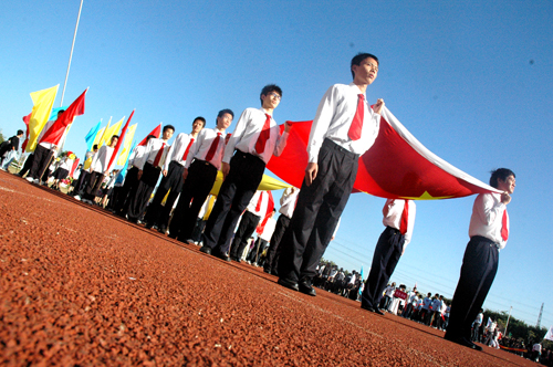 冬日的运动场阳光和煦,凉风习习。 灿烂的笑容、跃动的旋律填满了暖洋洋的体育场。 在暖暖冬阳里,青春在张扬。  阳光倾泻在国旗上(图/实习生 苏俊鸿)