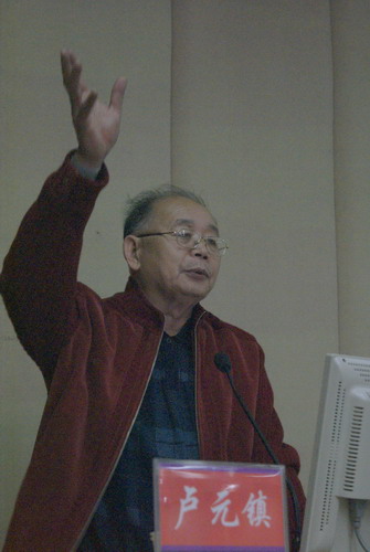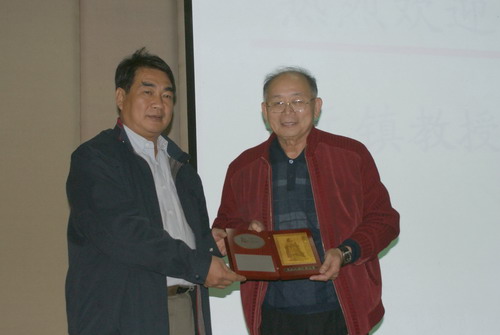 本网讯 11月27日,由我校人事处主办、体育部承办的著名教授论坛第八十一讲在我校北校区六角报告厅开讲。华南师范大学博士生导师、教授卢元镇应邀为我校师生做了主题为“2008后北京奥运中国体育首选主题词——改革”的精彩演讲。副校长陈子锐,体育部主任林少娜,人事处副处长李悦明,体育部副主任陈春燕、李旭武等出席了此次讲座。讲座结束后,陈子锐代表我校赠送纪念品。