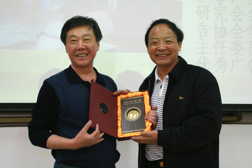 本网讯 11月24日下午3:00,武汉大学新闻与传播学院教授张金海应新闻学院的邀请,在南校区C507为广外师生带来一场人文大讲堂的精彩讲座——《广告业的未来发展与广告学知识框架的重构》。新闻学院院长郭光华、党委书记胡文涛、副书记陈华荣出席了讲座。郭光华向张金海赠送了礼物。