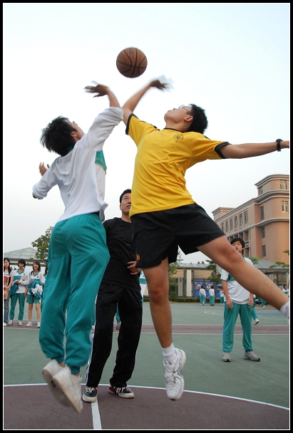 下午5时,维多利亚学校的男生们与外校初三年级的学生在篮球场上进行了一场激烈的篮球友谊赛。