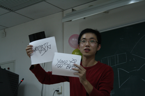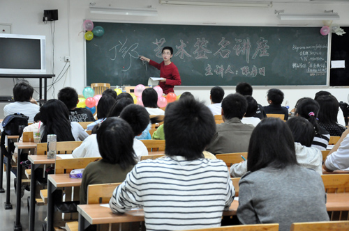 本网讯 11月14日晚,由我校书法协会主办的艺术签名设计讲座“你告诉我你的名字,我告诉你它有多美”在南校区E203举行。广州书法家协会会员、广州亚运会服装设计专家组成员陈彦明为大家讲解他独创的艺术签名。