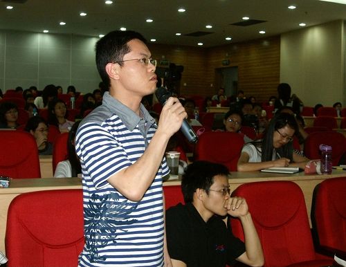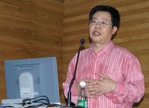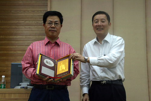 本网讯 11月6日下午,著名教授论坛第七十七讲在北校图书馆多功能报告厅鸣锣开讲。复旦大学中文系教授陆扬为广外学生深入阐发了德里达“解构主义”的精髓。出席讲座的有副校长方凡泉,人事处副处长谢文新,英文学院党委书记何洪亮。本场讲座由人事处主办,英文学院承办。讲座开始之前,副校长方凡泉向陆扬赠送礼物。