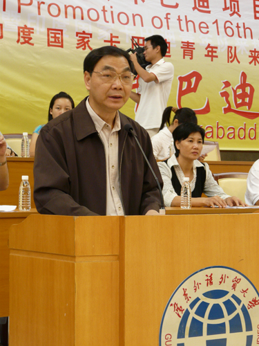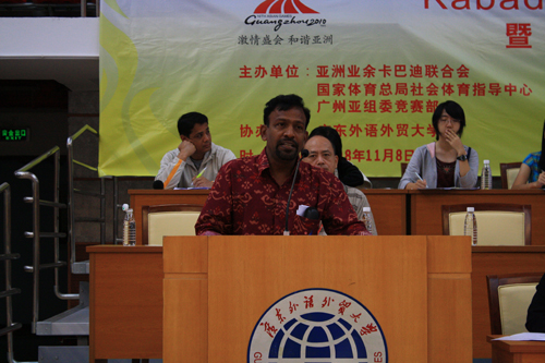 普拉塞德·劳先生随后的致辞充满激情和幽默。他表示北京亚运会正式确立卡巴迪为亚运会项目说明中国和卡巴迪有着不解之缘。因为中国和印度占有世界上的大多数人口,他确信如果更多的中国人加入卡巴迪活动的行列必然会推动卡巴迪在全球的推广。劳先生希望在亚运会中印度代表团能与中国代表团对决,并再次感谢本活动对展示亚洲传统运动做出的努力。
