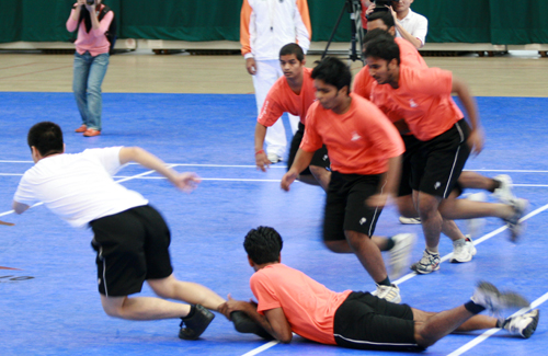 广州体育职业技术学院中专班的同学们首先为同学们献上了中国民间游戏“老鹰抓小鸡”,带动了全场观众的气氛。卡巴迪就是印度版的“老鹰抓小鸡”。