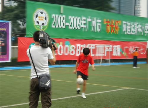 足球场上,我校一足球运动员在向广州电视台记者“秀”球技