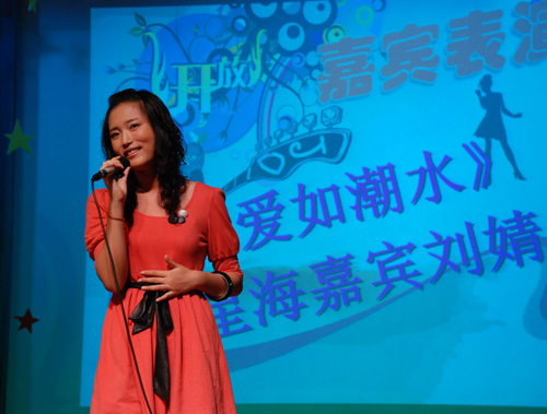 在第二环节激动人心的DJ主持SHOW后,来自法学院的彭晖亚和孙行为大家献上相声《这一夜,我们来扯淡》,他俩幽默的语言逗乐了现场的观众。在第三轮比赛结束之后评委进行紧张的打分的同时,来自星海学院的特邀嘉宾刘婧一曲清新、柔美、风格迥异的《爱如潮水》博得观众的喝彩。