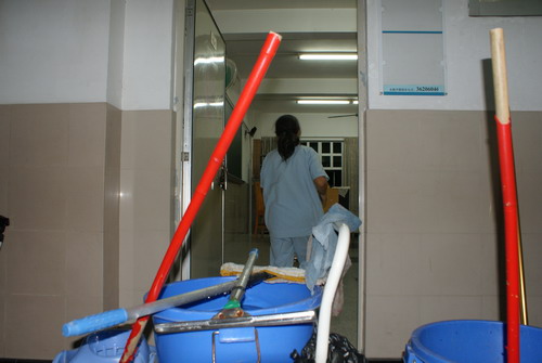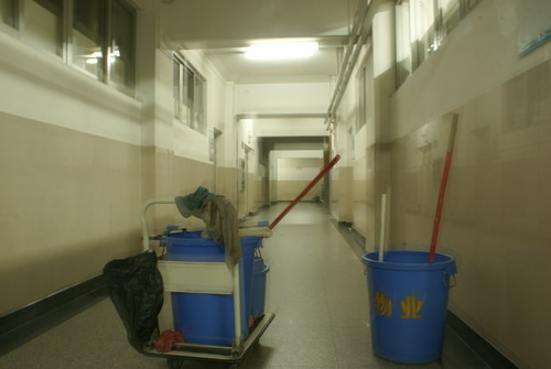 拍摄完这一张照片,记者的相机的电池已经“断气”(没有电量)了。于是不得不告别阿姨。彼时时间是24日十一时五十五分,根据阿姨的说法,她还要继续工作四个小时。四个小时,对于大学生来说,或许并不那么漫长,因为在电脑前,我们一坐下来或许就不止四个小时了。可是,对于一个重复着艰辛体力劳动的清洁员来说,漫漫长夜何时是个头?
