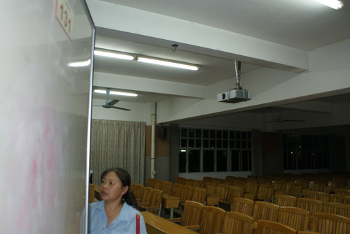 记者走进二教130课室,物业公司的清洁员何望花阿姨正在打扫。何阿姨看到突如其来的记者正在拍摄,并没有过多的在意,依然旁若无人地打扫。