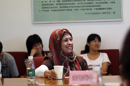 在努曼总书记的发言结束后,在场的学生努力把握机会,积极提问。学生王玉想了解也门一些大学的情况。也门社会党政治局委员、妇女部部长娃海比娅.艾哈迈德.穆罕默德.萨布拉(Wahbia Ahmed Mohamed Sabra)作了详细回答。她说现在也门出现一种非常新颖的教学模式――家庭教学,即国外大学的留学生来到也门后,当地的家庭会把他们当作家庭成员一样,让他们在家庭里学习阿拉伯语,学习也门的文化。她说她接待过一位德国的留学生,那位留学生表示在她家里两个月所学的东西远远超过她在大学四年所学的一切。她笑着说道:“希望贵校对这方面有所考虑,我们已经做好准备接待学生到家里了!”