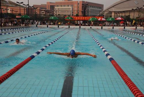 本网讯 10月23日下午,由我校体育运动委员会主办的“2008年广东外语外贸大学游泳比赛”在南校区游泳场举行。本届比赛设有23个个人和4个接力项目总计27枚金牌,来自15个学院的100多名选手向各自的金牌发起了冲击。经过激烈的争夺,经贸学院的游泳健将们凭借270分的高分,以领先第二名136分的巨大优势摘得了团体总分的第一名。