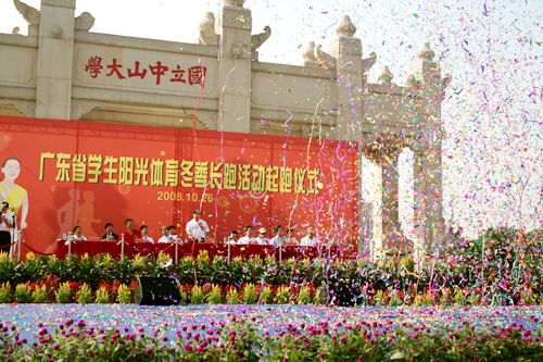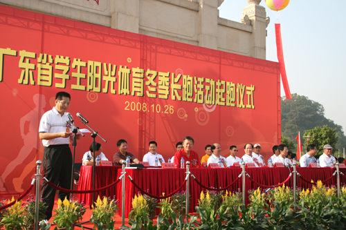 10月26日上午,广东省学生阳光体育冬季长跑活动起跑仪式在大学城中大正门前举行。出席本次活动的嘉宾有广东省教育厅副厅长李学民,省教育厅副巡视员钟云彪,省教育厅体卫处处长莫宝光、副处长许舒翔,省共青团相关领导以及各学校领导等,我校副校长仲伟合也出席了此次活动。此外,广东外语外贸大学、中山大学、星海学院、广州大学、番禺新造中学、穗石小学等十二所学校的学生参加了起跑活动。