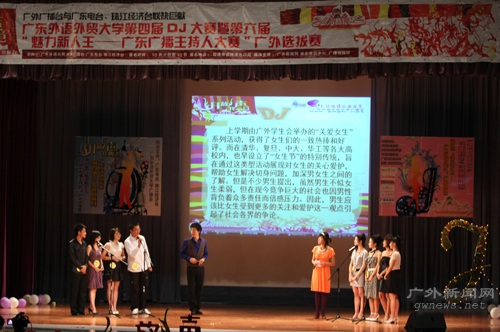 本网讯 10月20日晚7时,广外第四届DJ大赛复赛暨第六届“魅力新人王——广东广播主持人”广外选拔赛在南校B8学术报告厅举行。此次活动由广东电台、珠江经济台和我校广播台联合主办。出席此次比赛的有我校新闻与传播学院党委书记胡文涛、党委宣传部副部长李江、新闻与传播学院党委副书记陈华荣、校团委的林宏伟老师。珠江经济广播电台总监助理陆敏华,广东电台DJ程朗、李嘉、鲁力,新闻与传播学院老师李峻岭、陶曼和艺术学院老师杨欢担任比赛评委,香港歌坛新秀可岚担任了表演嘉宾。