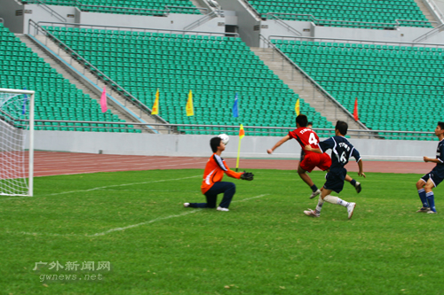 “大家都要往前冲,加强进攻,冲击对方后防线!”中场休息时,落后一球的广外明星队员商量战术时如是强调。