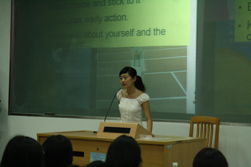 陈荔是92届广外英文系的毕业生,作为广外的师姐,她首先简单地描述了她的工作历程,提出职业规划就是要“知己知彼,百战不殆”。她表示,良好的自我认知包括自己对才能,兴趣以及价值取向的了解。只有清楚自己想从职业中获取什么,才能作出正确的选择。另外,求职时还需要明确企业和部门的文化是否与自己的价值取向相匹配。