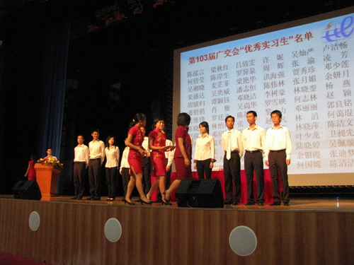 大会的第二个环节,由中国对外贸易中心外联处处长、交易会外事办副主任彭巧玲女士为第103届广交会“优秀实习生”颁奖,并对该170位优秀实习学生给以高度的评价,并鼓励参加本届广交会的同学们能向获奖同学学习,再接再厉,圆满完成本届广交会接待工作。