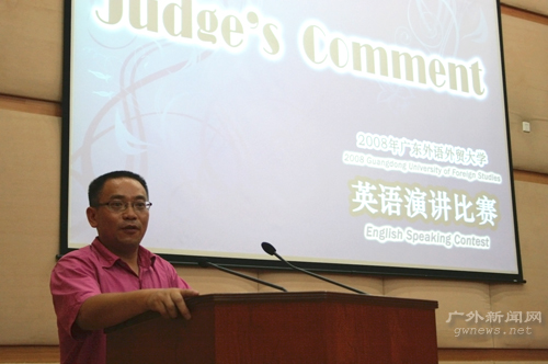 最后,冯光武进行了简单点评,对选手们的表现给予了高度评价,他欣喜地说到,很高兴看见那些非英语专业的同学也踊跃地参与比赛,享受比赛。同时,他从语音,语调,语速技巧性方面对选手提供了建议并精辟地提出,做一个成功的演讲,应该记住一个单词wise!其中W、I、S、E分别代表wit、interesting、special、excellent。