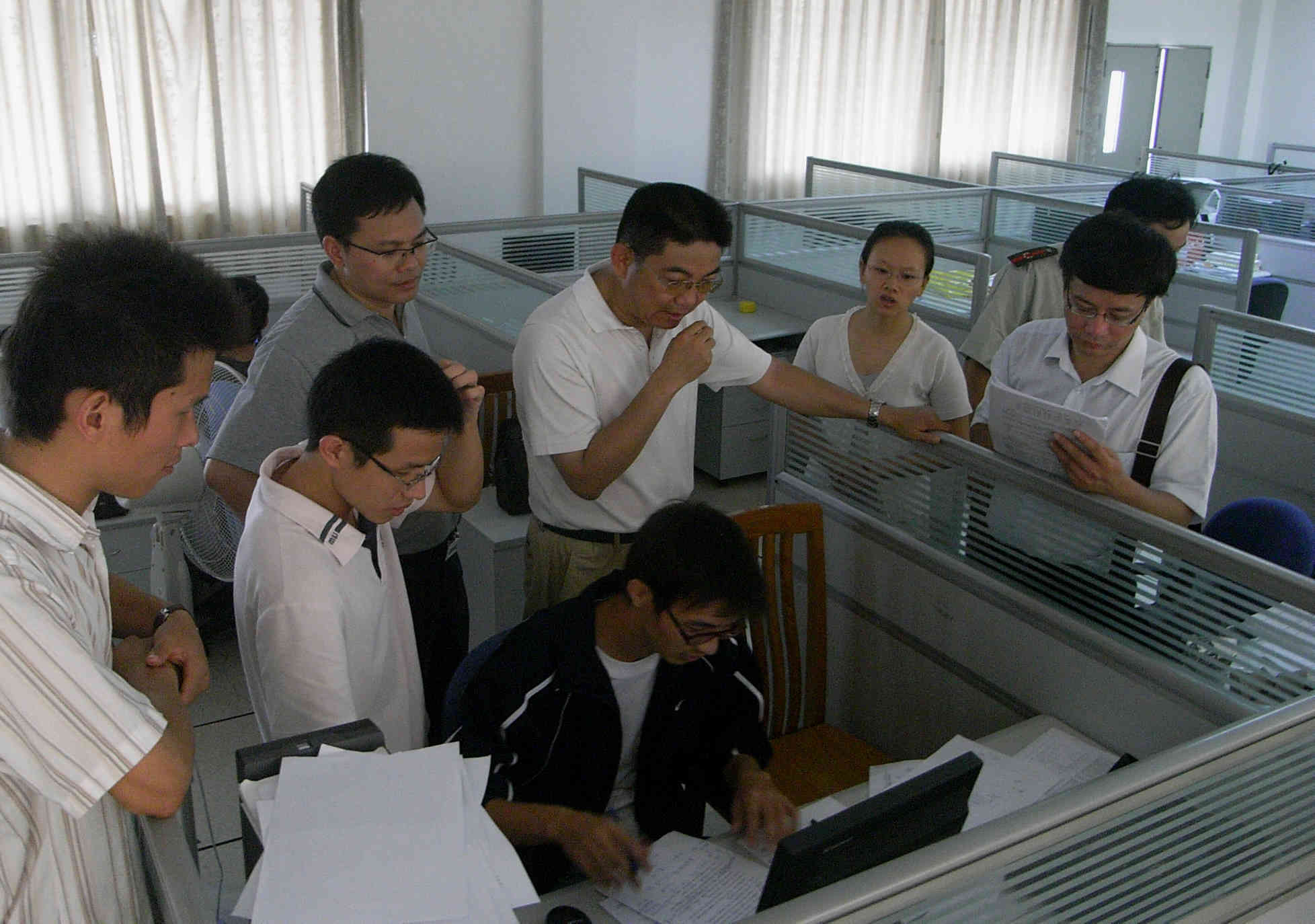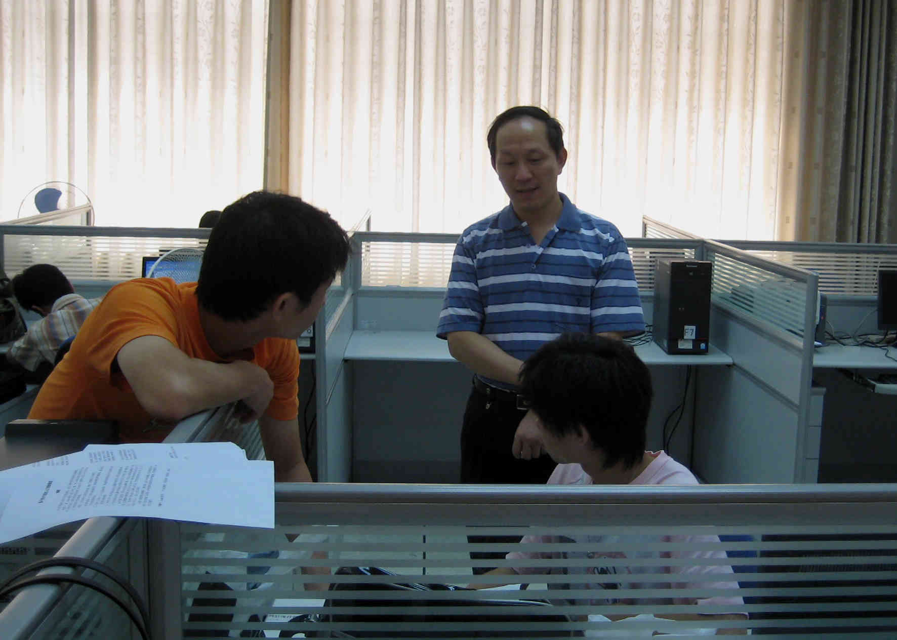 20日上午10时许,校团委书记刘志军、教务处处长刘建达、教务处副处长孙家和一行人在信息学院副院长蒋盛益和党委副书记曾智鹏的陪同下,来到了实验室对参赛选手进行慰问探访,为他们解题出谋划策。
