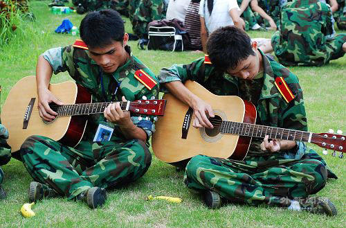 “广外欢迎你,未来开始清晰,团学团联勤工将有你的身影。广外欢迎你。在云山下绽放美丽,在文心湖超越自己。” 歌声轻快悠扬,这首广外人自编自唱的《广外欢迎你》,军训新生也忍不住在轻快的吉他声中一起唱了起来。