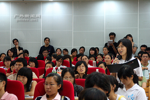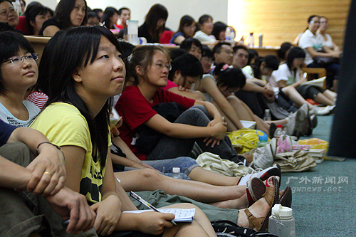 讲座还未开始,多功能报告厅内早已是一座难求,走廊、过道、角落及台前都挤满了席地而坐的听众,报告厅三扇门外也尽是向内企趾翘望的听众。