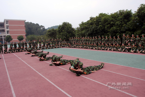 据悉,此次的救护训练分为三部分:人工呼吸、胸部按压以及身体各受伤部位的包扎技巧。为了让每位学生都能够实践操作各个救护技巧,军旅领导安排一名教官讲解和十名学生演示,以每两个排为单位开展演练。由于时间关系,当天只有十五和十六连的学生参与此次训练,十七和十八连的学生们则照常技能训练。此次负责讲解的是十五连三排的教官,他挑选三排中平时表现较优秀的2男8女等十位学生进行演示。