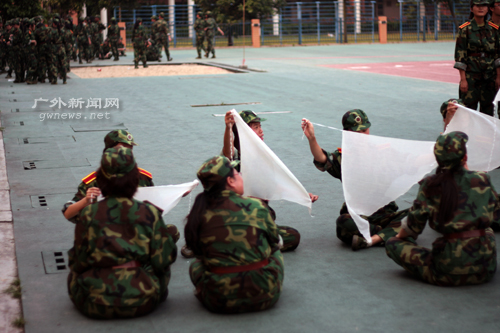本网讯 9月7日下午,北校区的军训场上,“伤兵”随处可见:有的头部被白色三角巾绑住;有的胳膊被夹板夹住并吊在脖子上;更有甚者,居然倒在地上“不省人事”。场景颇为“壮烈”。那是五营进行军事训练的救护技巧演练现场。