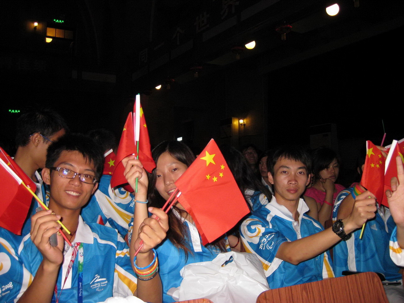 当天晚上,来自广东的27名残奥会志愿者齐聚清华大学大礼堂,与1000多名清华学子一起观看残奥会开幕式,共庆残奥盛事。当中国代表团以东道主的身份最后一个出现在鸟巢时,广东志愿者带头喊道:“中国!”全场学子随声高呼:“加油!”群情激动,震撼人心。整个大礼堂里不时响起一阵阵欢呼声和雷鸣般的掌声。