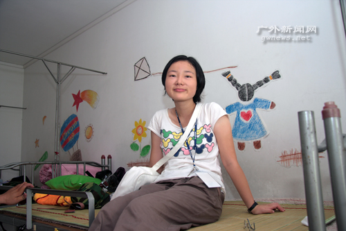 经过一个小时的整理,小吴坐到床上脱下眼镜要求记者帮她拍一张照片。小吴说背面的墙上的图案太漂亮了,要留影纪念。