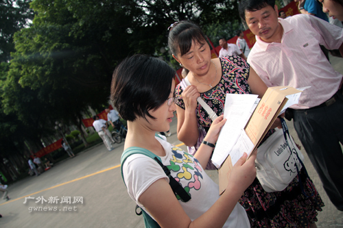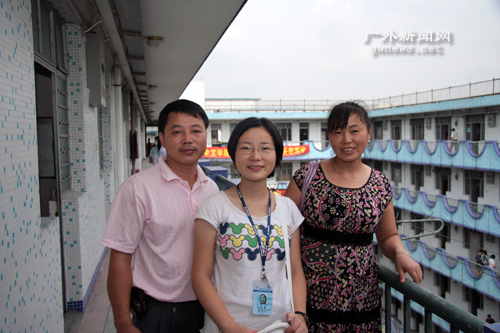 小吴在父母的陪同下打开了属于自己的新生入学的第一份“家当”——自己的胸卡、饭卡、宿舍钥匙等。她正在小心地检查着自己这个意义重大的文件袋。这个时候还没到早上八点半,校道上报到的新生还很少。