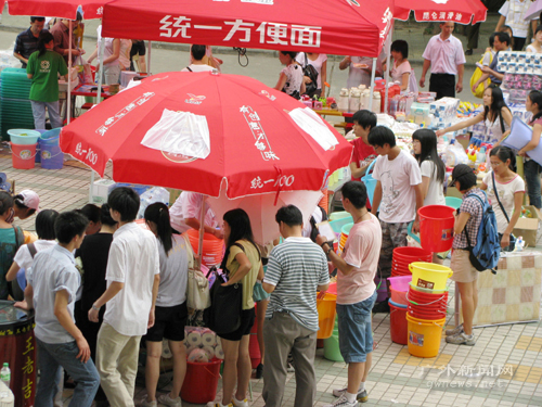 兴安超市广外店早在8月30日上午就开始在北校学生宿舍13幢前空地搭棚摆摊。在摊前,提桶、风扇、凉席等生活用品样样齐全,锁头、衣架、面盆等颇受新生的青睐,而新增的书摊、公仔摊也不乏新生驻足。