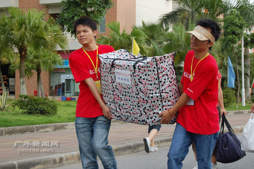 早上6时许,各学院以及校团委、学生会等志愿小组已经各就各位,开始一天忙碌的志愿工作。代表团委、学生会和团联的志愿者小怡一上岗位就忙碌起来。据她介绍,志愿者的工作是指引新生及其亲友到相应的学院接待点,若遇到新生需要帮忙提行李,他们就暂离岗位帮新生搬运行李。