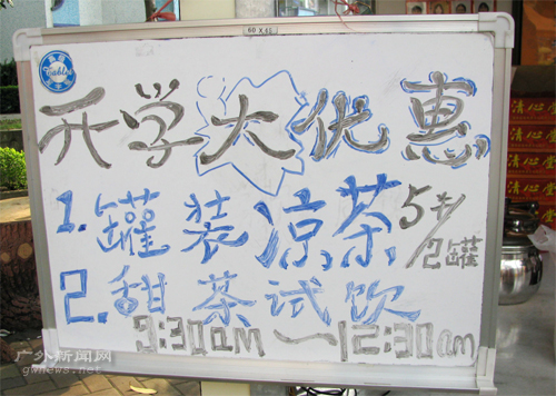 我校勤工助学中心实体之一云山清心阁则不同于校内外超市的营销方式。该实体淡化商业气息,倾情为远道而来的新生提供免费试饮。此外,该店还特别推出优惠产品,让新生在初来之际便感受学校浓浓的人文关怀。