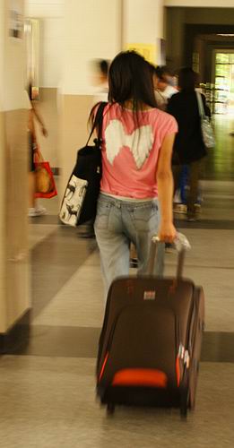 早上八点多,一辆满载新生及其家长的校巴驶进校门,老老少少兴高采烈地走下车,其中一个身穿粉红色T恤、牛仔长裤,一直在拨打手机的cool女孩吸引了记者的目光。她独自拖着行李箱,提着几个袋子,身边并没有同伴。