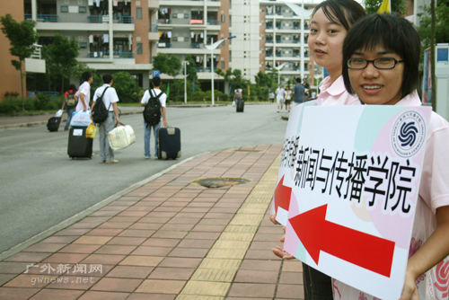 为了方便新生注册,登记宿舍,缴纳学费,各学院志愿者六点半就在校道、绿化区、各教学楼宿舍楼梯处安营扎寨,并设置了指引牌,迎接来自全国各地的新生。
