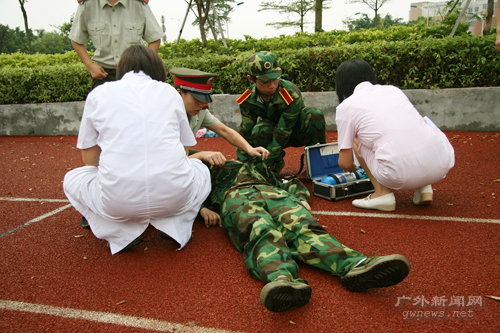 在北校,东语学院的朱同学在暑假时胃做过大手术,军训十天前刚出院的她身体还没完全恢复,但她坚持参加军训。“这是最后一次参加军训,很想留下美好的回忆。”东语学院08级辅导员沈永英表示像朱同学这样带病训练的学生队伍中还有三四个。