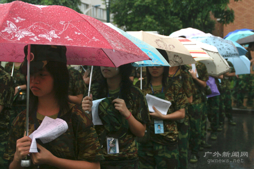 军训年年有,今年特别“湿”。从开学那天起,广州就经常遭受雷阵雨的“突然袭击”。9月4日是军训第一天,南北校的军训均受到了天气不同程度的影响。在学校领导和师兄师姐们种种担心下,08级五千多名的“90后”新生开始了他们为期16天的军训生活。