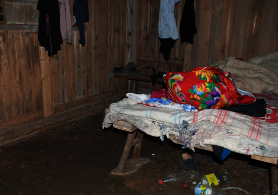 当终于推开了球媛家里的门,队员小红感慨道:“终于见识到了传说中被誉为‘最为复杂’的瑶族传统建筑——吊脚楼”。正屋建在层层用石头铺成的地基上,厢房三边悬空,靠柱子支撑。正屋和厢房的上面主任,下部有柱无壁,用来喂养牲畜、堆放杂物。因为长年失修,屋内的木柱黯淡无光泽。屋内设备奇少,一张磨掉了漆露出木的灰色的灶台是他们的“饭桌”,一张印记斑驳的自制木凳是他们待客的“沙发”,一个残破不堪的柜台上一片凌乱,四面木柱苍凉地裸露着,上面挂着大大小小的包,那是缺少家具摆设而想出的储存东西的方法。