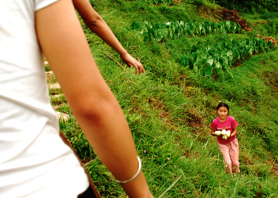 很难相信在这样起伏连绵的群山上竟然可以开垦出规模宏大的梯田群,在层层叠叠,高低错落的梯田群上端,竟然还可以坚强地挺立着黑黑的木楼。在瑶寨群的最高点,孩子们为队员“指点江山”:“那是平头寨,那是杨梅寨……”泗水乡的瑶寨布局很散,三户两户地散落在各处,有山顶,有山脚,也有山涧和山岗。