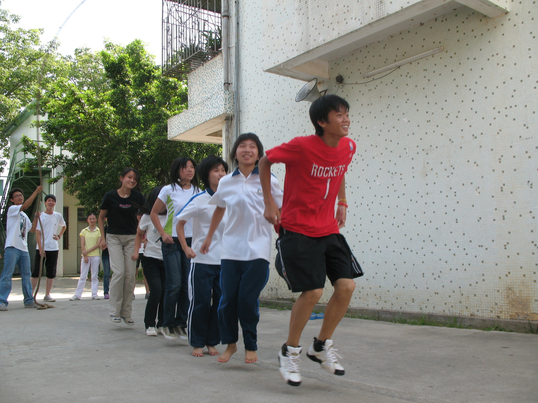 项目二“跳大绳”。每个小组的组员依次跳入跳绳中,跳进人数越多得分越高。比赛中,有两个小组6人全部跳进并且坚持了15下,最后满分胜出。有个同学说:“领头的同学带得好,整个组跟着节奏,就像飞一样。”