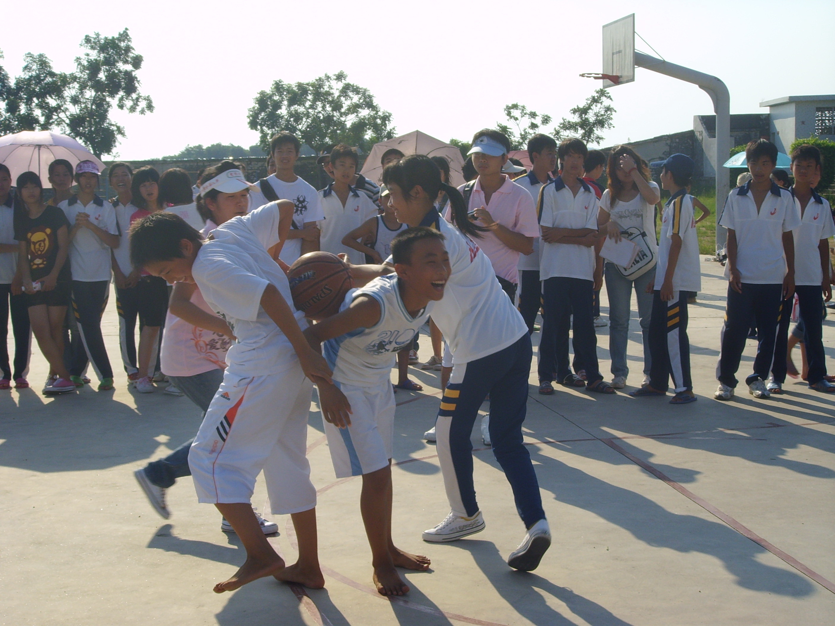 这个项目可谓是全场的高潮。两个同学背靠背,在尽可能短的时间内,把篮球运到对面半场,让另外一名同学在原地旋转三圈后,投射入篮。一声令下,同学们紧紧握住对方的手,只求把球稳稳地夹在后背上。他们小心谨慎的样子,时不时地惹得观众们哈哈大笑。