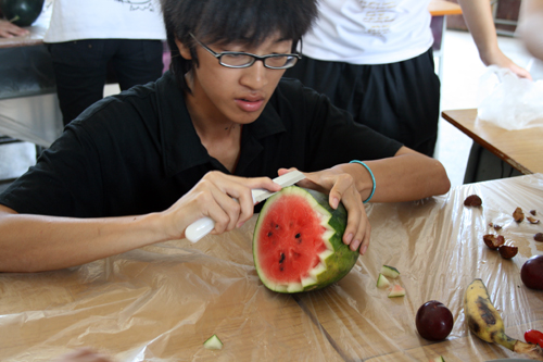 薪火相传队员将学生带回教室,在围好的桌子旁坐成一圈,准备对派发下来的各种各样的水果进行大拼盘。有西瓜、布林、梨、香蕉、荔枝、圣女果等水果,同学们要充分利用自己的想象能力将有限的水果拼出一个有特色又好看的拼盘。