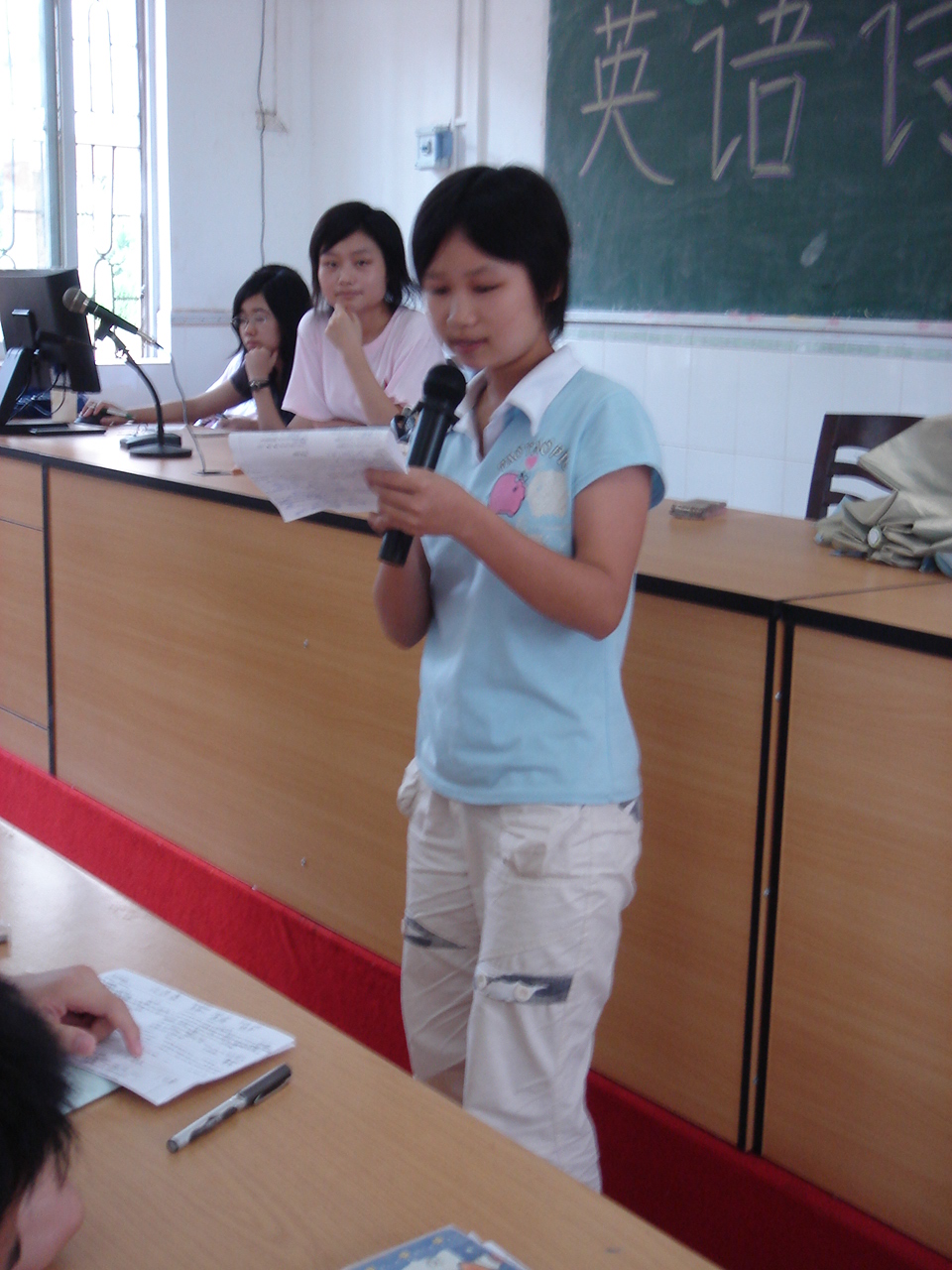 最后一位上场的是张丹凤同学。她的朗诵给了大家耳目一新的感觉,因为她凭借自己流利的英语给评委留下很深的印象。