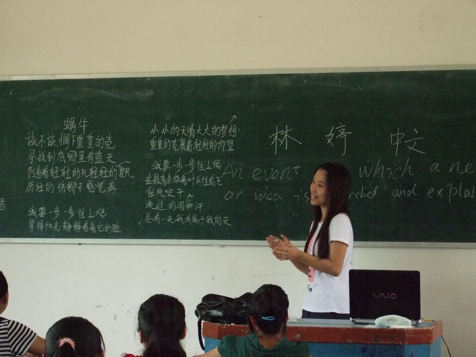 在老师的鼓励下,大家都齐声答应把歌曲学好,日后把它作为表演献给三下乡的队员们。学生们学得很快,虽然刚开始大家都比较腼腆害羞,但随后在林婷的带领下渐渐放开嗓音。优美的旋律,加上师生们认真的神情,甜美的歌声,霎时传遍教室每个角落,深深打动了在场的每一位老师。