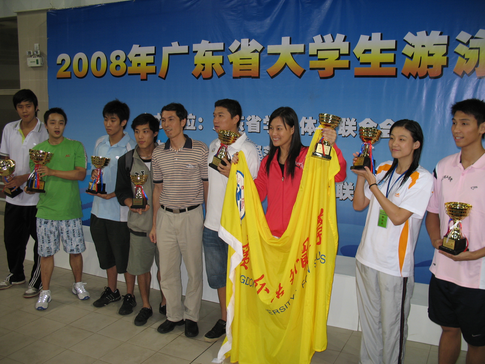 本网讯 广东省大学生游泳锦标赛于6月29日和30日在广州大学城华南师范大学游泳馆举行。我校游泳队在这次比赛中取得了可喜的成绩。游泳队共获甲组16枚金牌,占总金牌数的半数以上,获团体总分第一名。同时夺得乙组两银两铜,获团体总分第六名。