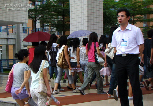 检查小组人员在A栋前检查 下午2点,南校检查小组一行来到教学楼E、F、G栋开始抽查迟到、缺课情况。尽管上课时间已过,但还是有很多学生陆陆续续地往教学楼走来,不少学生仍在等电梯。