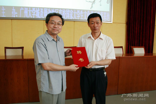 首先,许国彬向栾教授颁发了“广州大学城及周边地区‘文化素质大讲堂’讲师团特约讲师”的聘书。